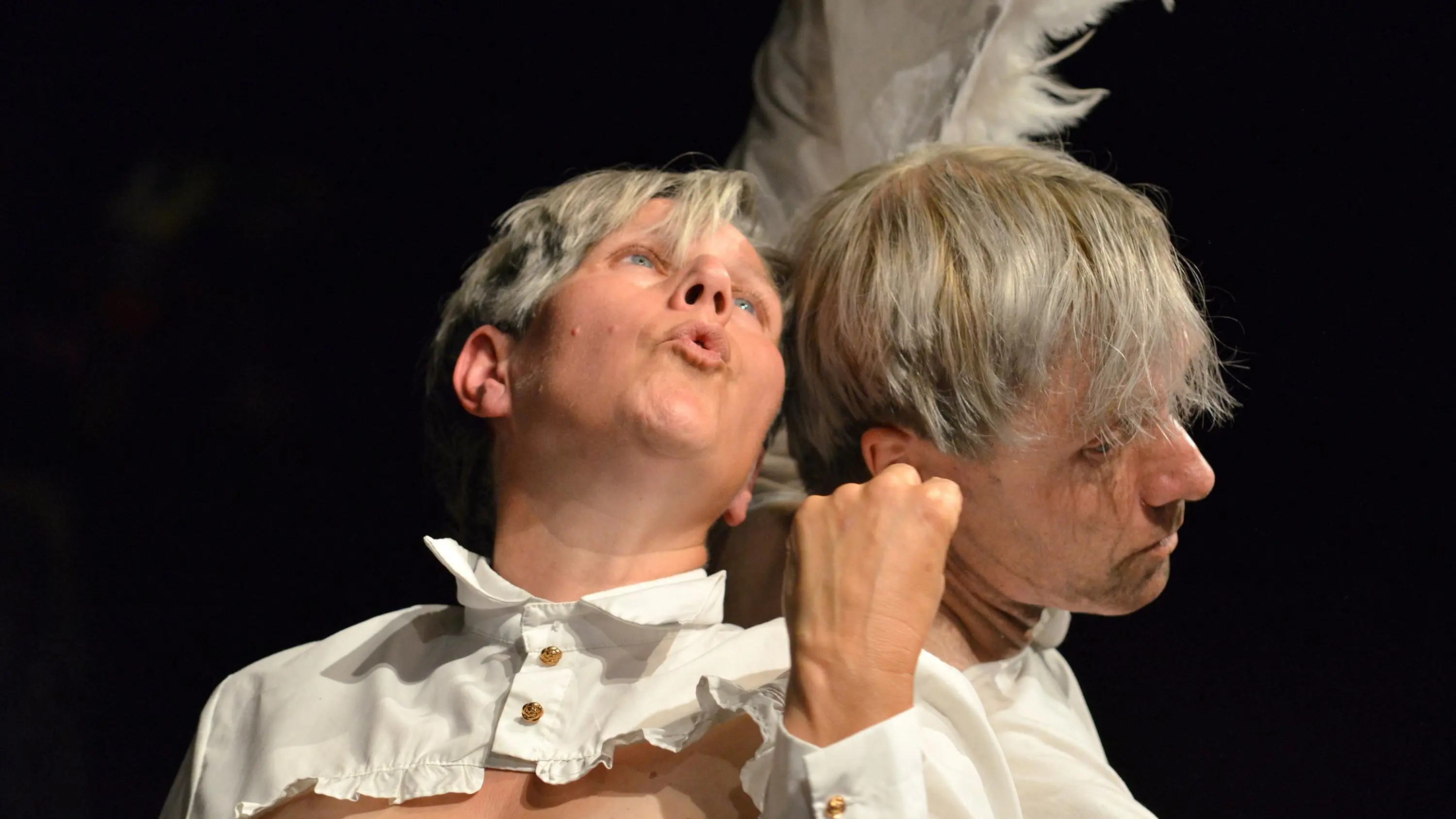 “Totally disturbing” remarked a pair at the enthusiastically received premiere, what the truly magnificent Mo Sauer - whose main job is as a schoolteacher in Mecklenburg-Vorpommern and the Tübingen computer scientist Mike Sperber directed by Henry Toma (Hamburg) exposed their audience to (having already performed in Greifswald, Rostock, and Hamburg), a concentrate of Heiner Müller’s “Quartet”, which again adapts the scandalous - obscene, decadent, blasphemous, cynical - novel of letters “Les Liasions Dangereuses” by Choderlos de Laclos from pre-revolutionary France and which it reduces to two characters in a gleeful and maybe scornful-cynical change of sexes and roles. Black-humoured Müller always wanted comedy, even slapstick comedy in his dark pieces.